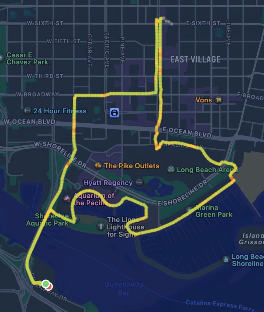 The walk around the Los Angeles River is very pretty and we enjoy the sunshine and pelicans fishing. A view back to Queen Mary contrasts the 1929 ship with an adjacent modern liviathan soon to embark on a four-night booze-cruise to the Mexico Riviera dwarfing her.