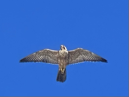We spot a bird of prey, apparently a juvenile peregrine falcon, enjoying coasting alongside the ship, occasionally dipping and swooping. They are known to watch ships and prey on other migratory birds who take a rest onboard.