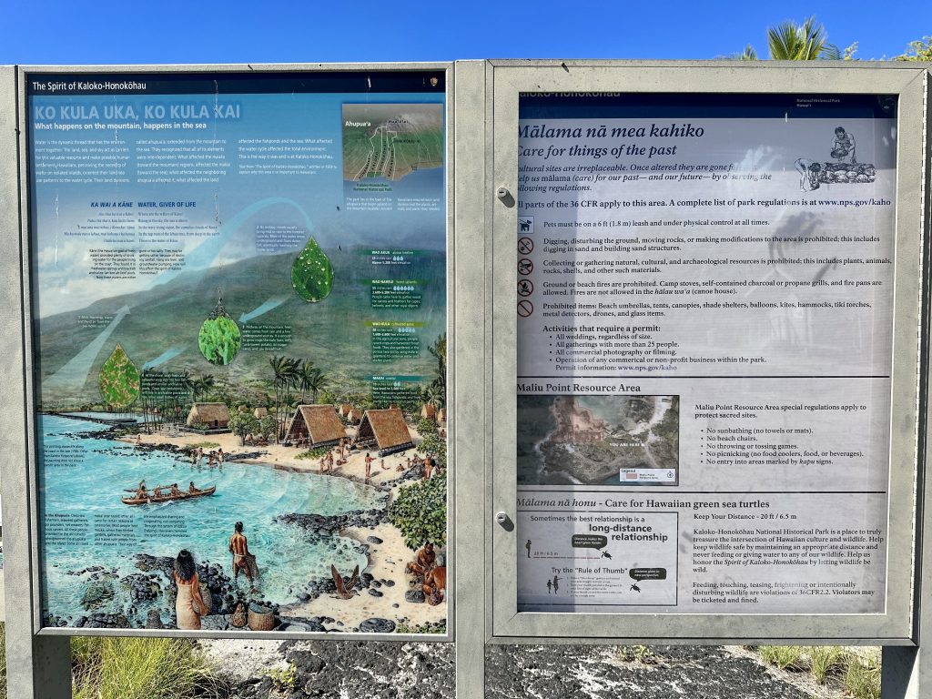 Our walk has to be on the road, but there’s a very wide cycle lane so we don’t feel as exposed as we usually are when walking US roads. We divert down to a colourful Honokōhau Marina and then across to the park entrance.