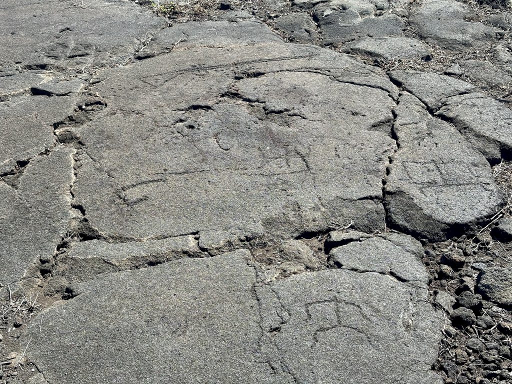 We turn of the coast and follow a pathway to the petroglyphs which are 1000 year old carvings on the lava, depicting ships, people and muskets.