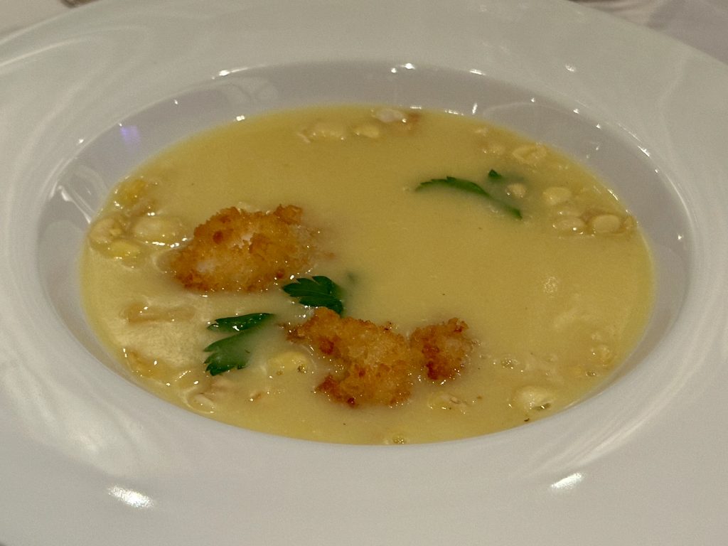 Tonight we enjoy seafood soufflé, corn chowder chateaubriand & cheese and caviar, corn chowder, lobster three ways and chocolate soufflé.