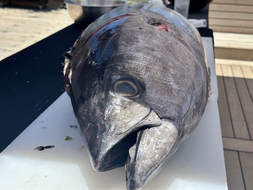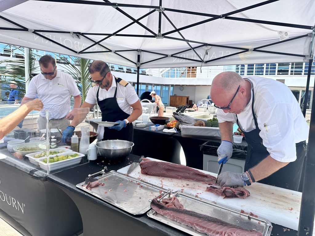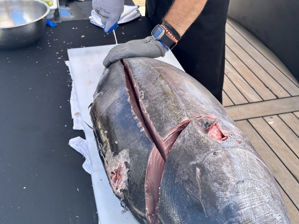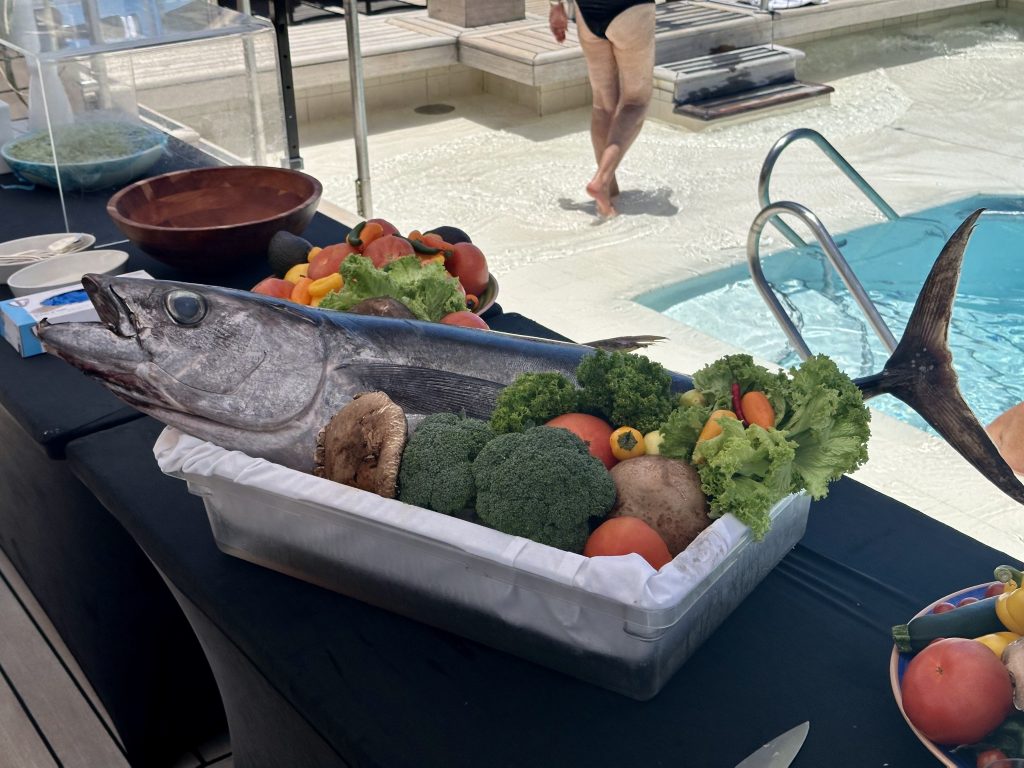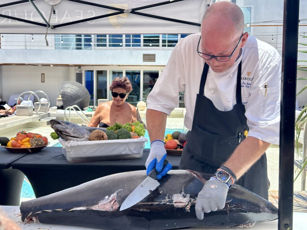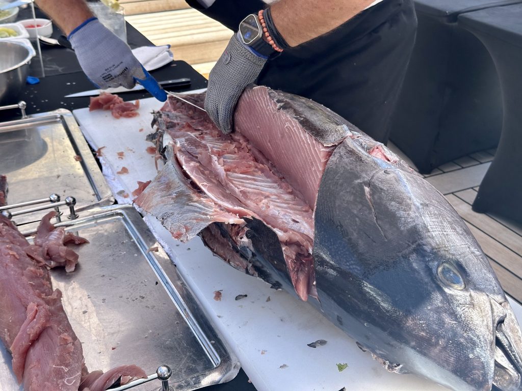 Having bought some whopping tuna in Papeete a couple of days ago, chef decides to do a tuna ceviche special, starting with the butchering of the fish, no small accomplishment in front of hundreds of people and in 30+ degrees heat.
