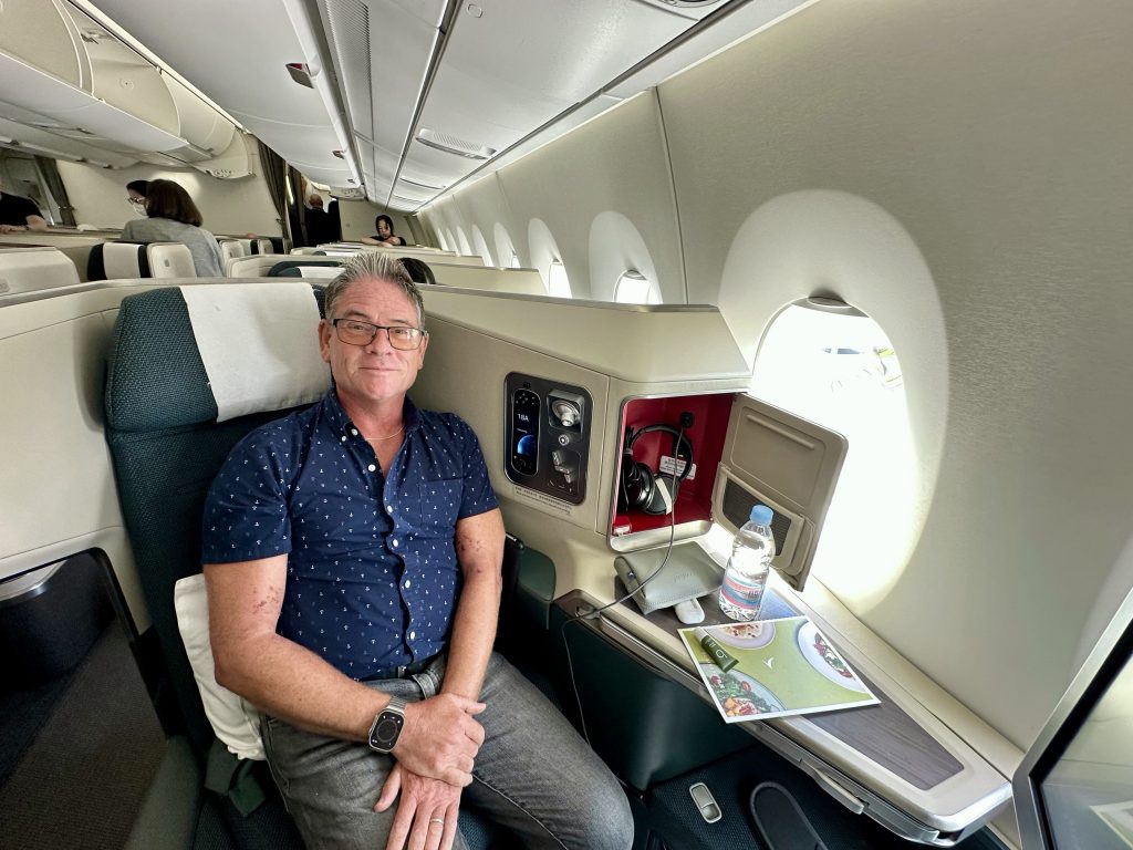 Eventually we land in Hong Kong with 41 minutes to find our next flight – a bit of determination and bombast pushes us to the front of security, then it’s some serious speed-walking to cover the two miles of terminal, and we board with five minutes to spare at 22:55.