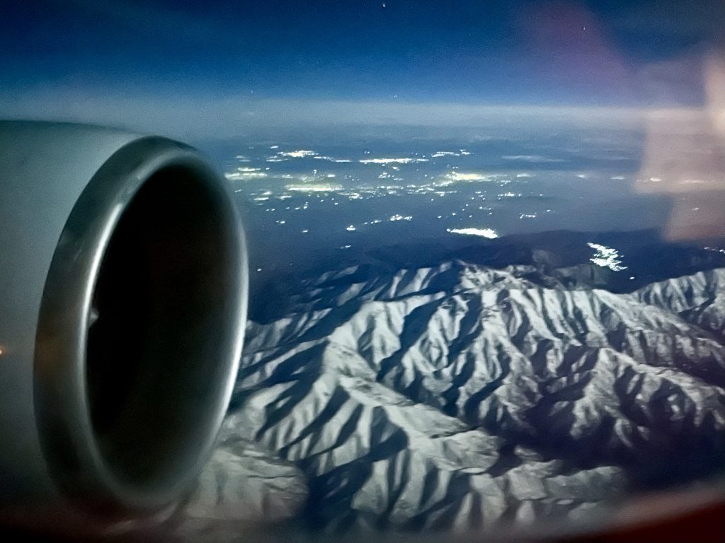 This flight is 14 hours but we manage to sleep half of it, just catching two films. There’s a great photo opportunity over Kyrgyzstan, the mountains in bright moonlight. Our route is quite a zig-zag as we wiggle firstly around the Himalayas and later avoid Russian and Ukrainian airspaces.
