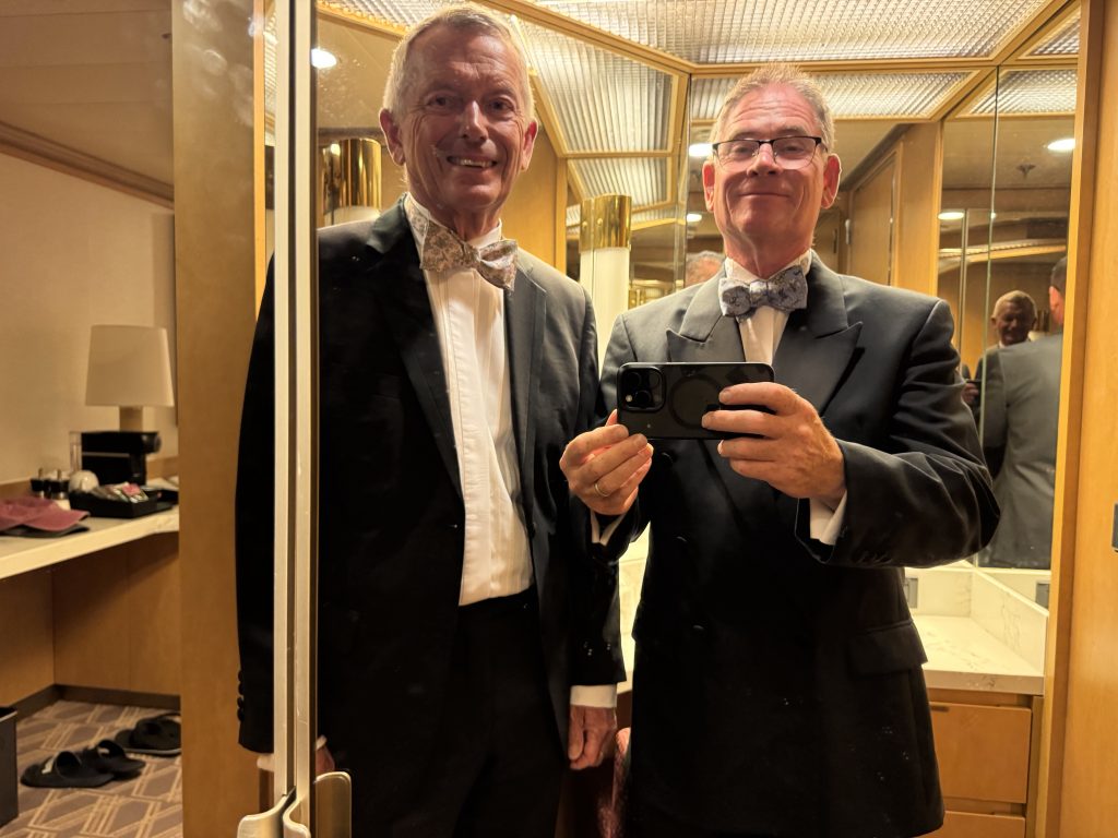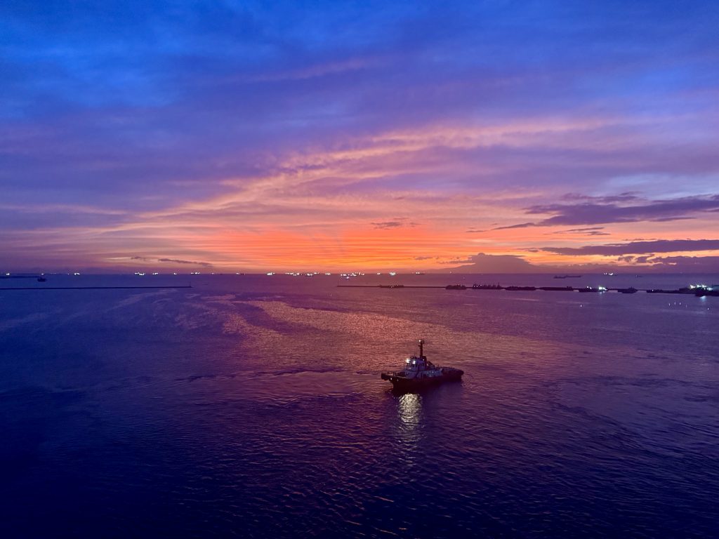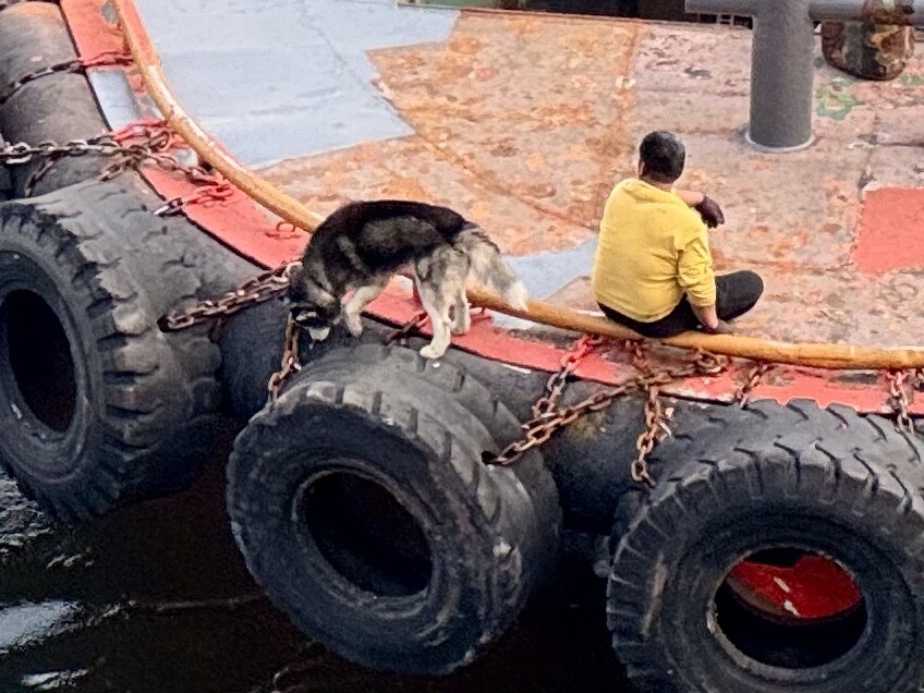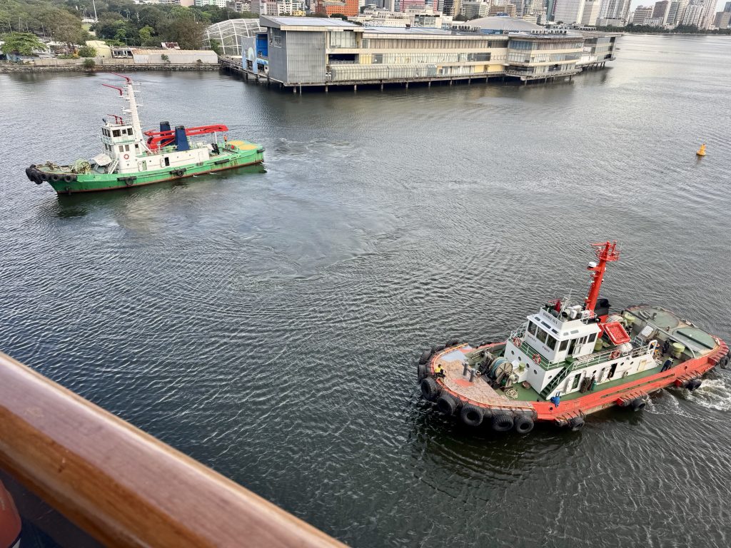 We’re supposed to depart at 16:30 but we are aware some tour coaches are stuck in traffic. Captain has no choice but to wait as these are HAL tours. In the end we’re only half an hour delayed. Meanwhile we watch as three quite unnecessary tugs are messing around us. The small one has an unofficial staff member with absolutely no fear!
