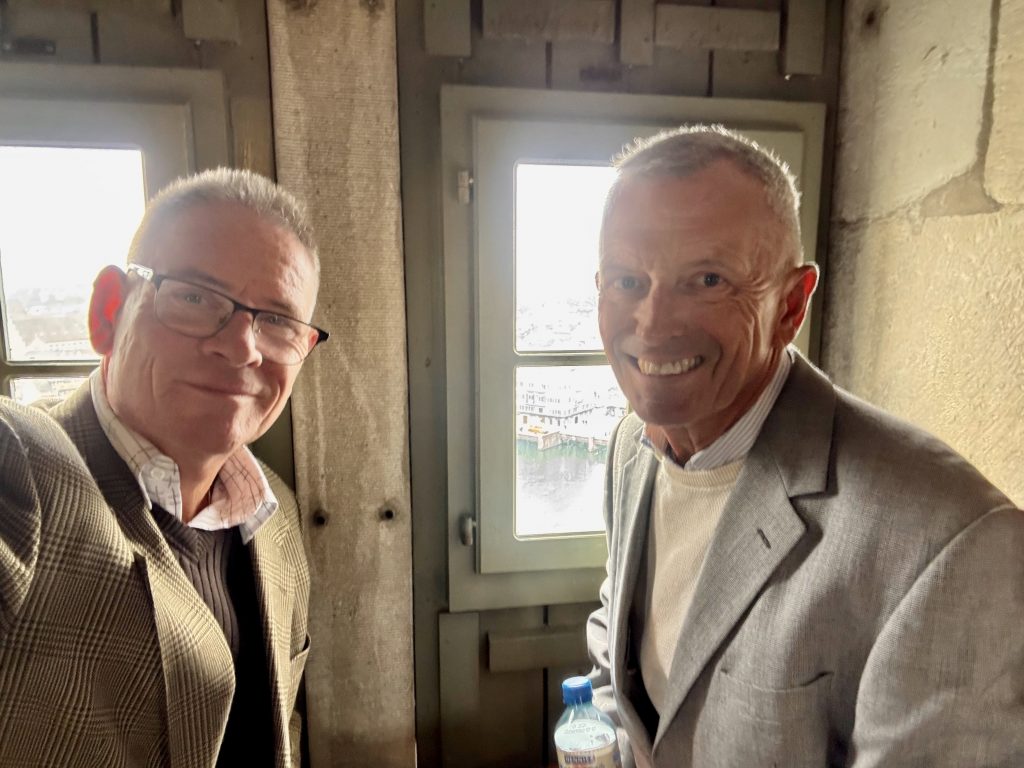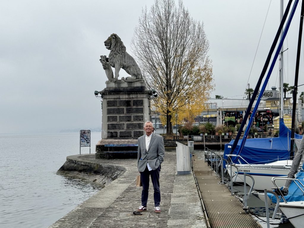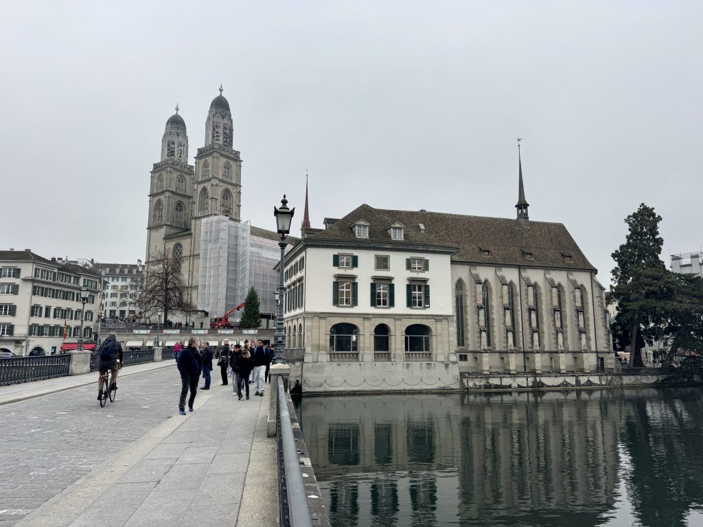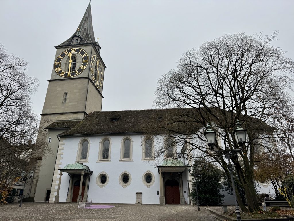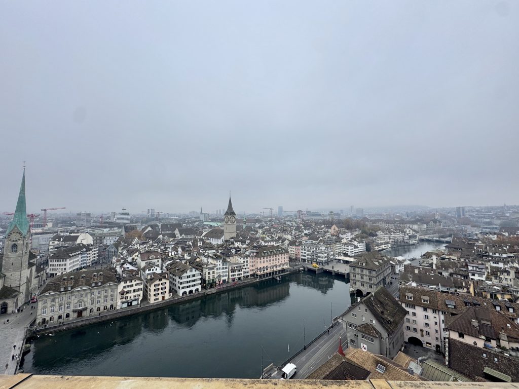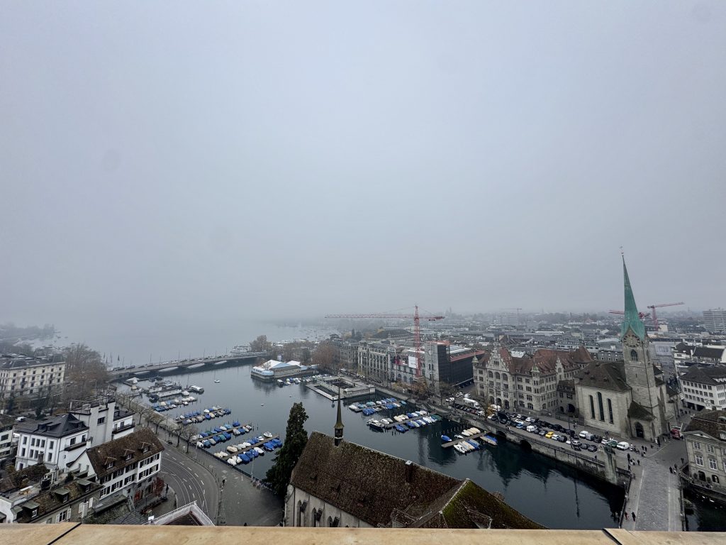 The three churches are St Peter´s (with the huge clock face), Fraumünster which we didn’t photograph because a funeral was just turning out, and Grossmünster where we climb the tower for views which might have been better but for the fog!