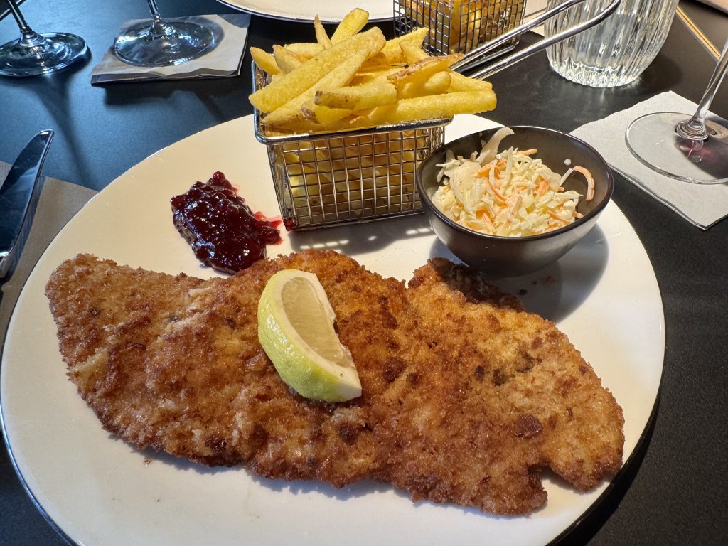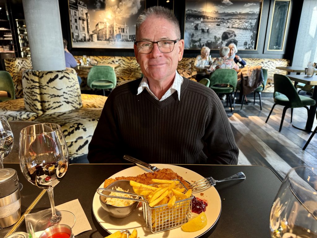 We walk up river a way, back to to the Oper Haus and then around part of the lake, happy that it would have been a disappointing cruise. Mid afternoon we find a nice hotel for late lunch and enjoy Weinershnitzel which is lovely, before aiming for our final goal, an area a bit like Salford Quays where a redevelopment has brought culture to the area.