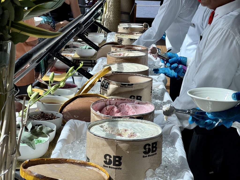 After lunch we laze, look at the ice cream stall, but reflect that on some other lines a member of the bar team would be pouring Baileys or some other suitable liquor over, so we don’t bother!