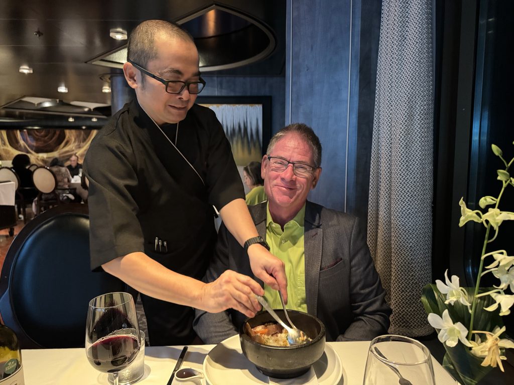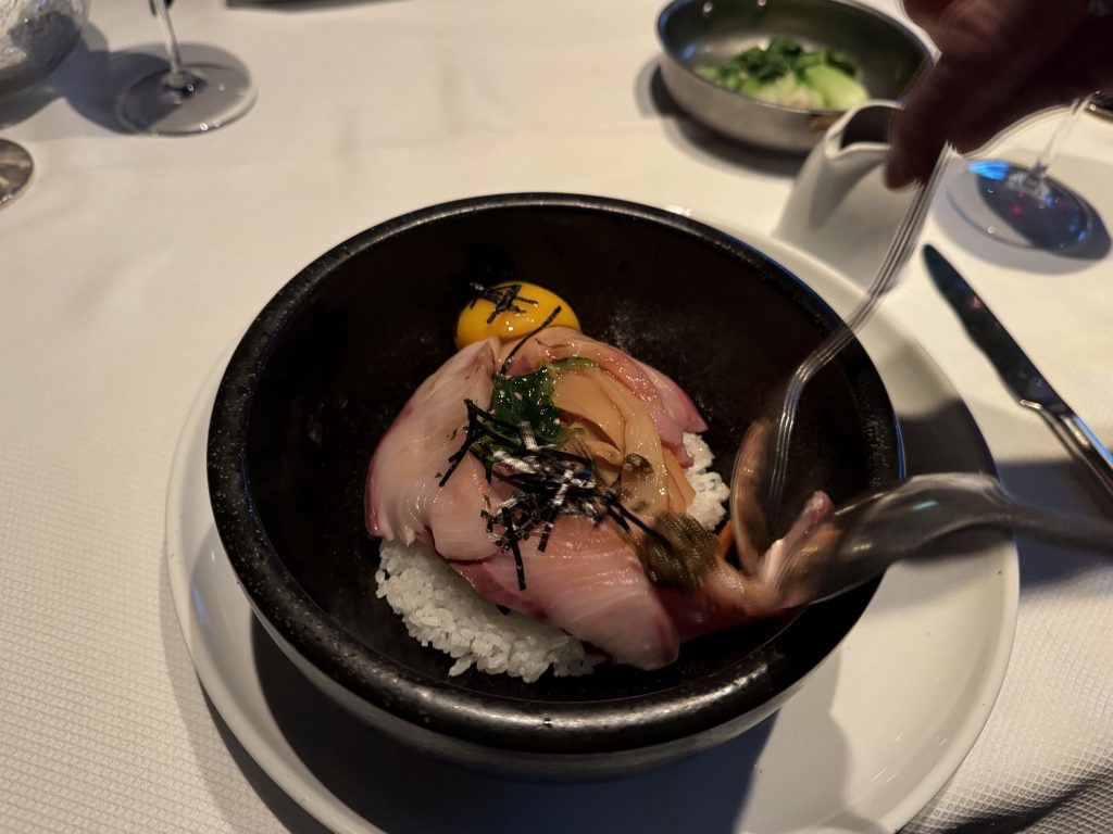 Dinner is the pop-up Morimoto again, we have a quandary – repeat what we enjoyed nearly three weeks ago or try something new. I try something new and regret it – I send back my calamari as it’s inedible rubber, and have some pork gyozo instead which are wonderful. Frans, the Pinnacle maître d’hôte comes rushing over to say he’s tasted the calamari and withdrawn it from tonight’s menu.