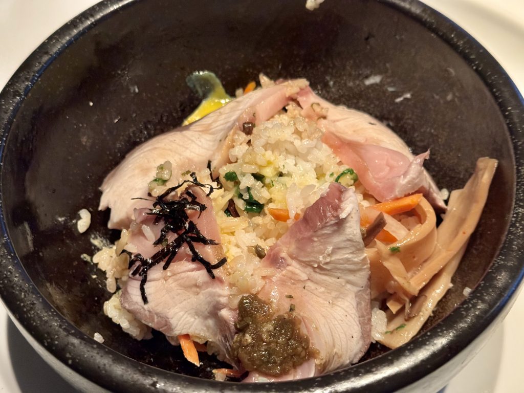 Mark sticks to the lobster again whereas I try the Ishiyaka Buri Bop, a very special hot-stone dish where the rice fries on the stone pot whilst the Buri – Yellowtail / Jackfish – cooks to one’s preference. The soy and rice wine accompaniment perfectly compliments the delicate flavours.