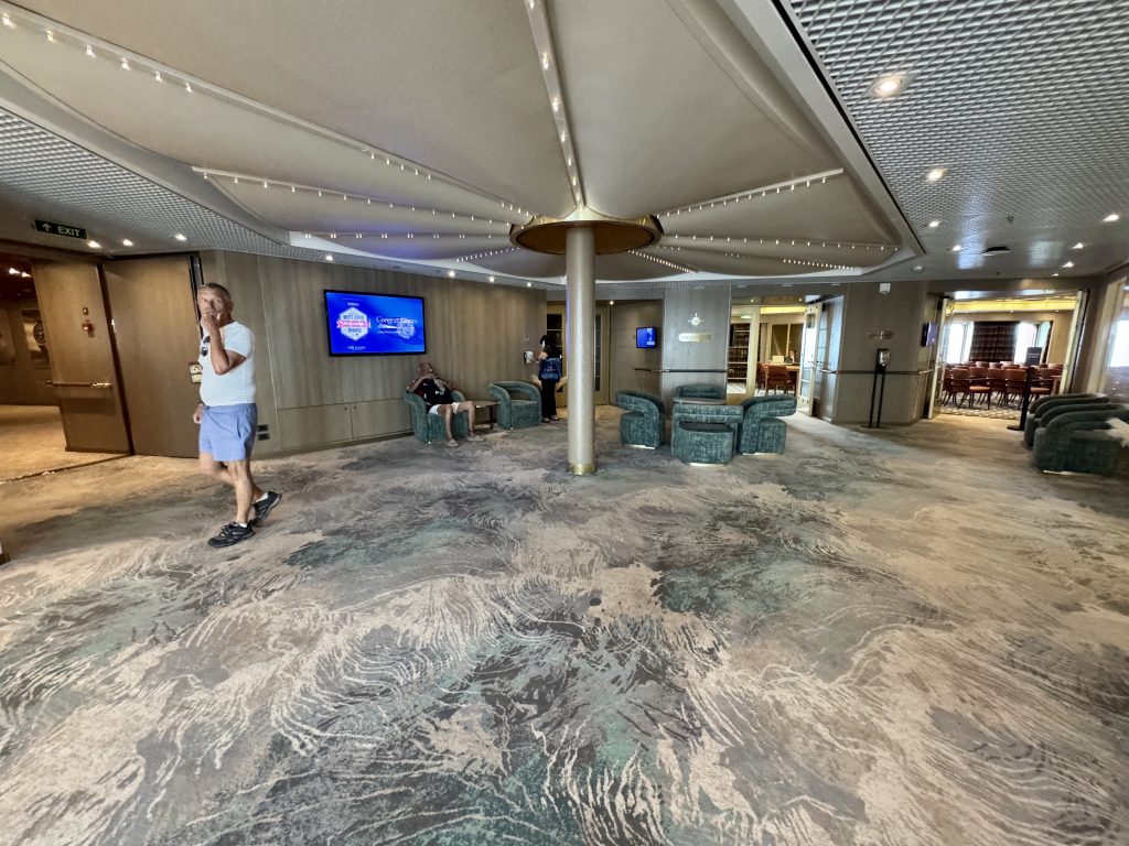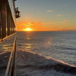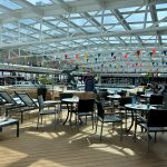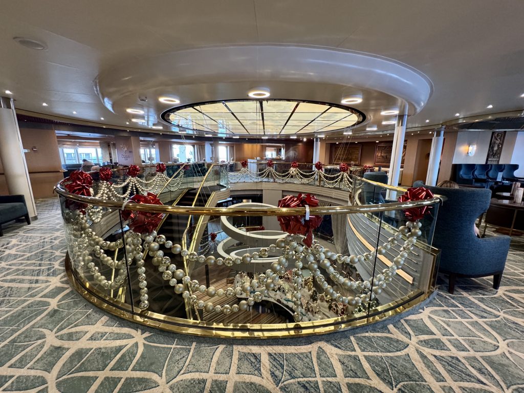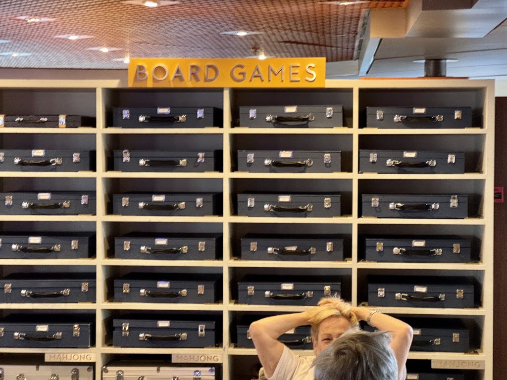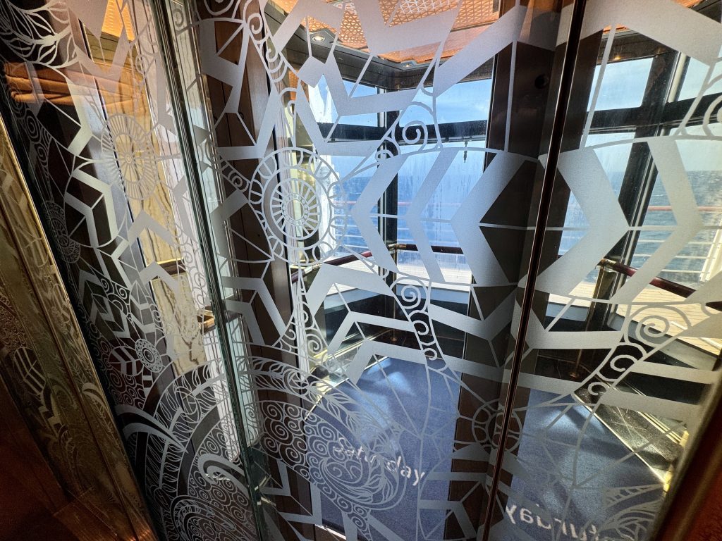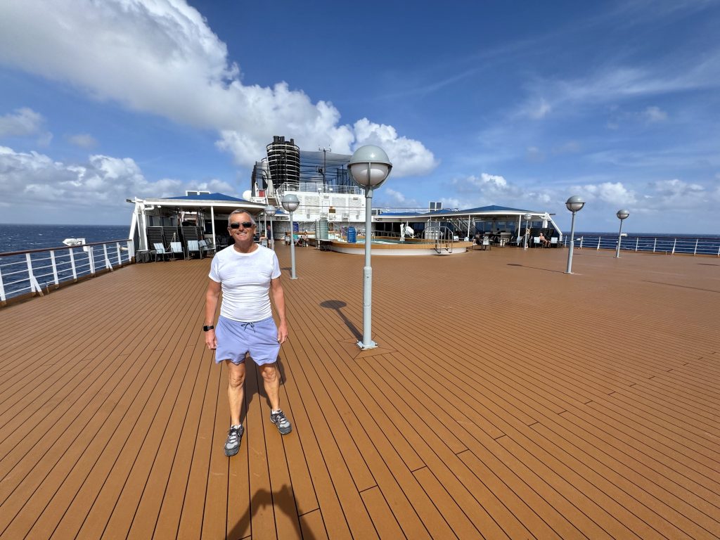 We start our walking inside, just on two and three, but it gets very tedious as we pass through the shops talking to the same sales staff every time, so we head down to deck one and start a circuit there. We walk every inch of each deck from one to nine, saying hello to every steward we come across, which is quite a few. When we reach nine we can go aft outside and notice that the stairs up to ten are not closed off, indeed there’s a man walking up there. So we head up and do our last 1.5 miles on ten. The wind is intense, and drags us around. We can understand why it should be closed, and probably still is, we just found a loophole.