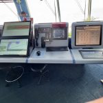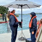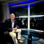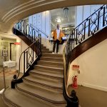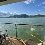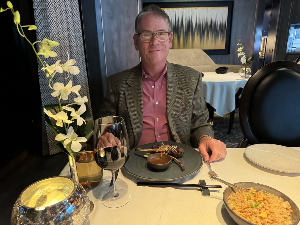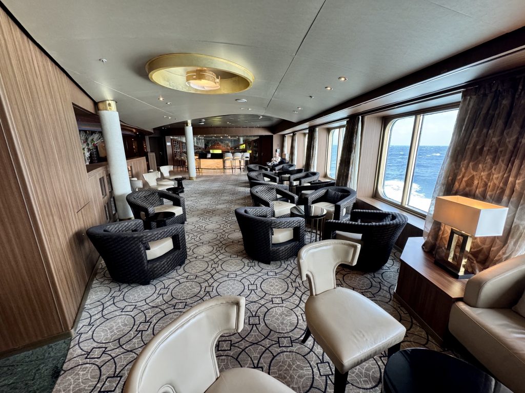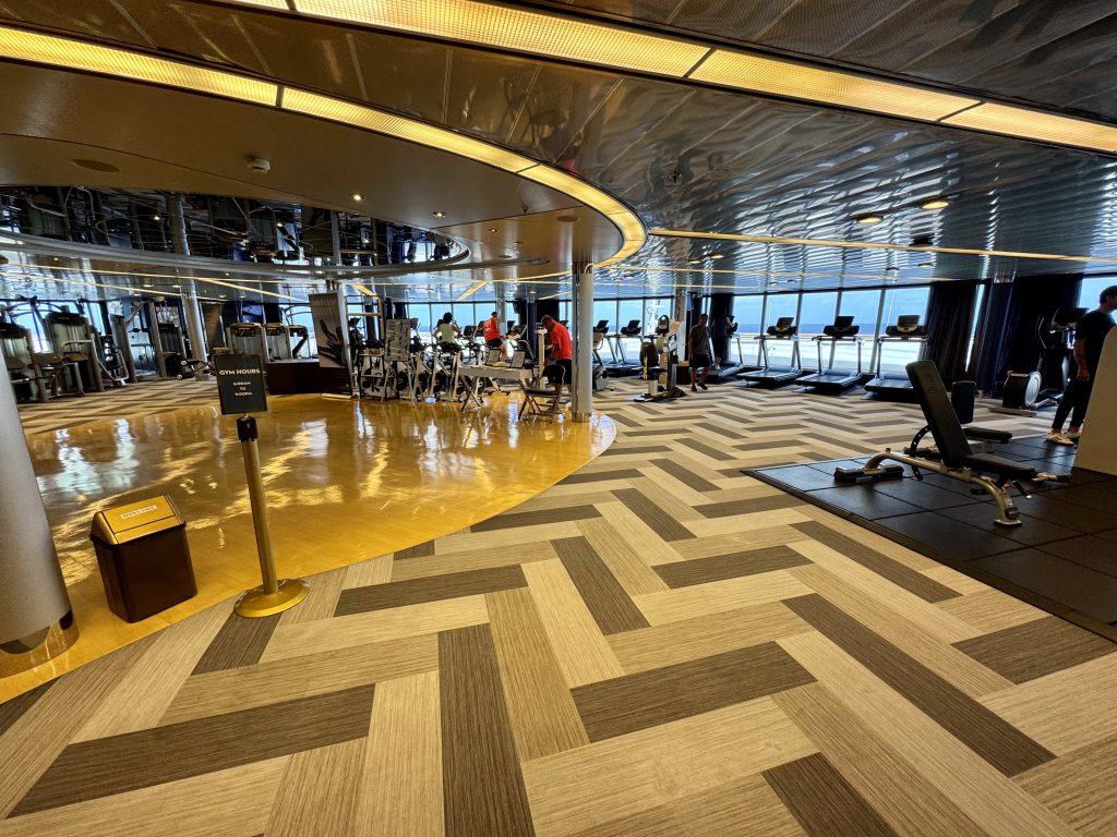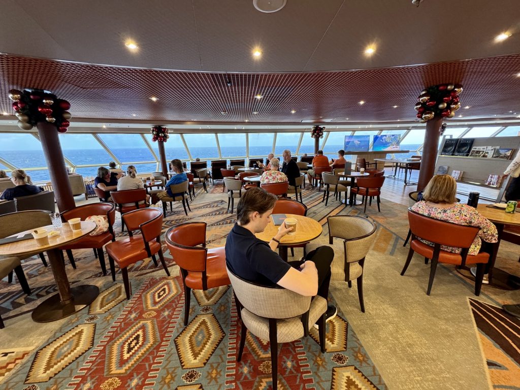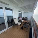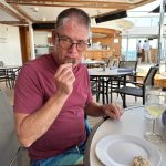 We start our walking inside, just on two and three, but it gets very tedious as we pass through the shops talking to the same sales staff every time, so we head down to deck one and start a circuit there. We walk every inch of each deck from one to nine, saying hello to every steward we come across, which is quite a few. When we reach nine we can go aft outside and notice that the stairs up to ten are not closed off, indeed there’s a man walking up there. So we head up and do our last 1.5 miles on ten. The wind is intense, and drags us around. We can understand why it should be closed, and probably still is, we just found a loophole.