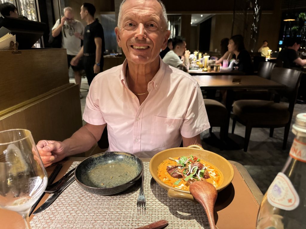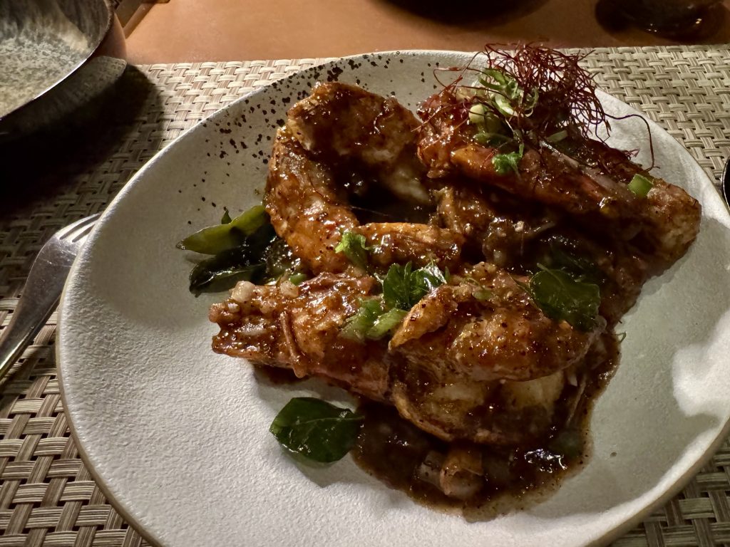 We contemplate going out for dinner, but one of the hotel restaurants is Thai fusion and has a particularly good rating, so we stay in and try this one. We only need one course, hubby has confit duck red curry and I have black pepper tiger prawns. Both are fabulous.