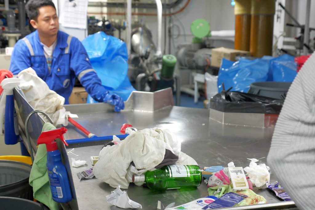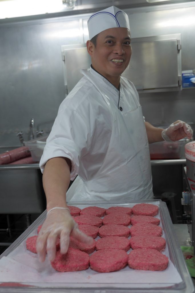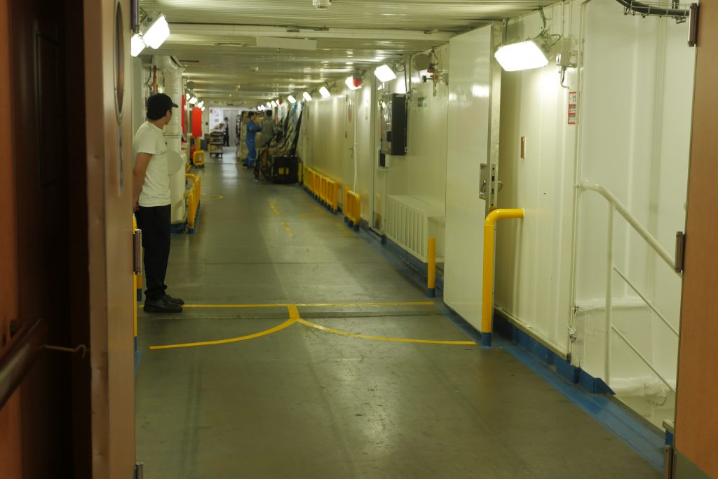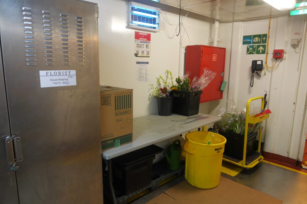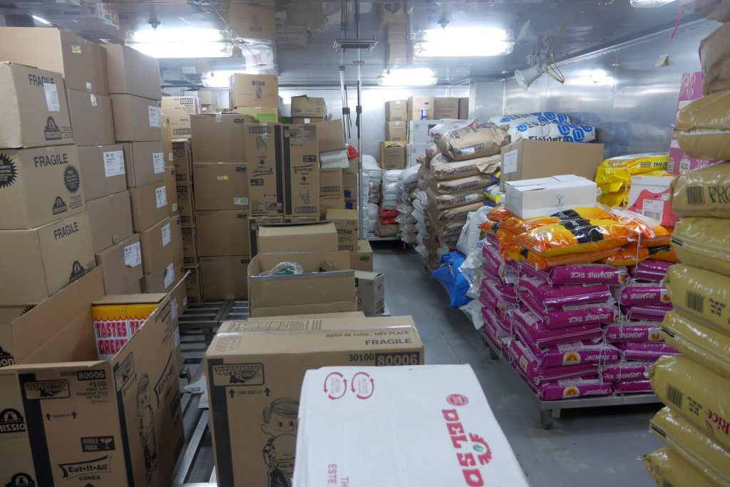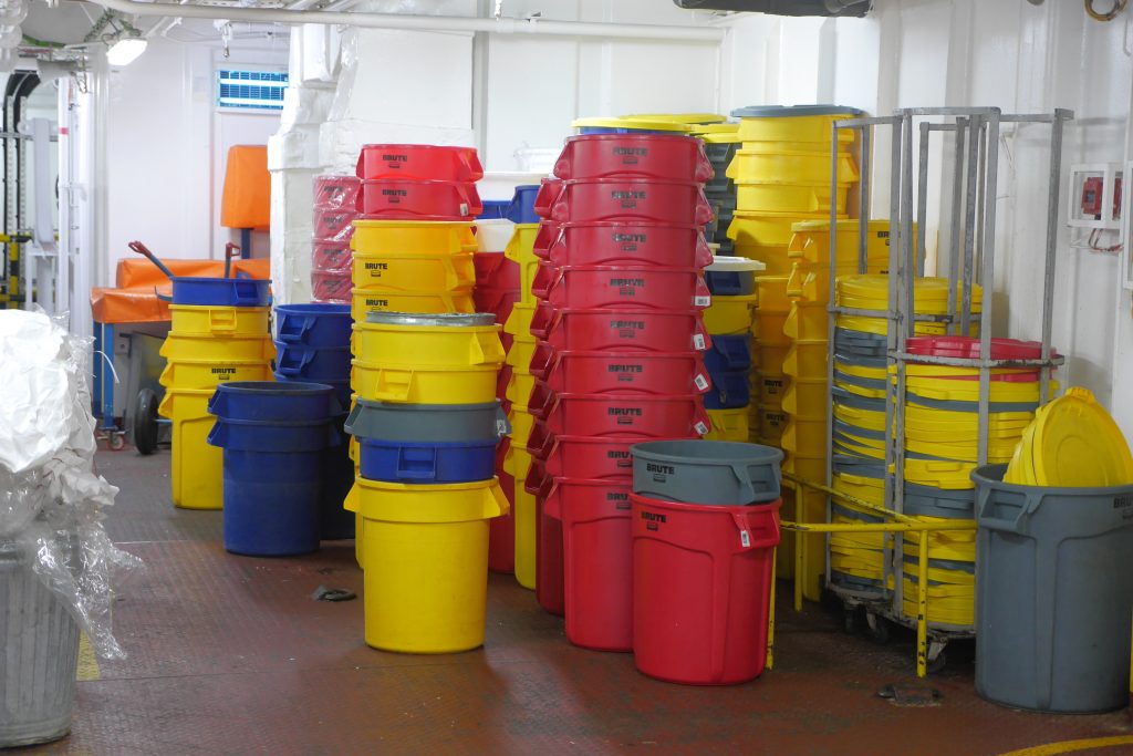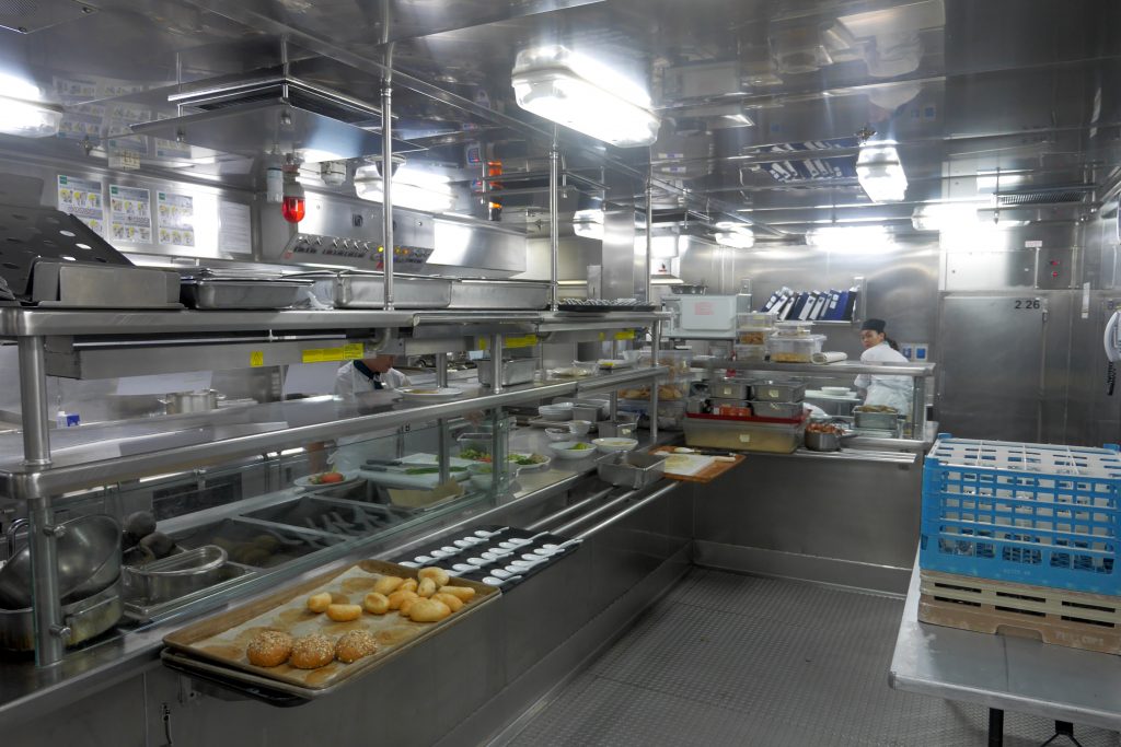 We see the staff canteen, saying hello to a few people we recognise, then on to the bakery for cookies, and the provisions stores. We walk past the unmistakable “dead centre” of the ship. Next it’s garbage, and finally we visit the galley.