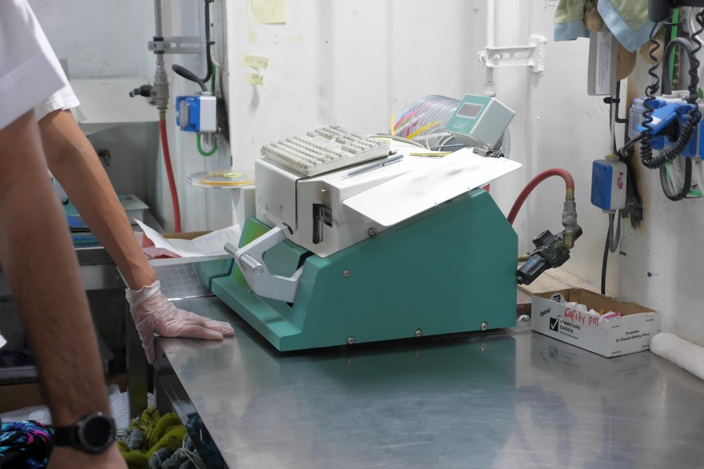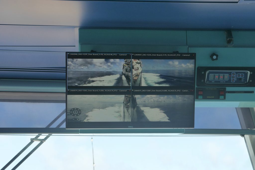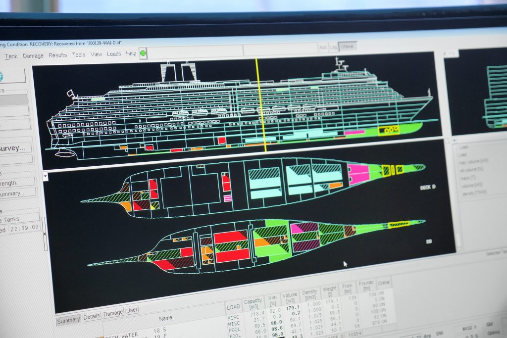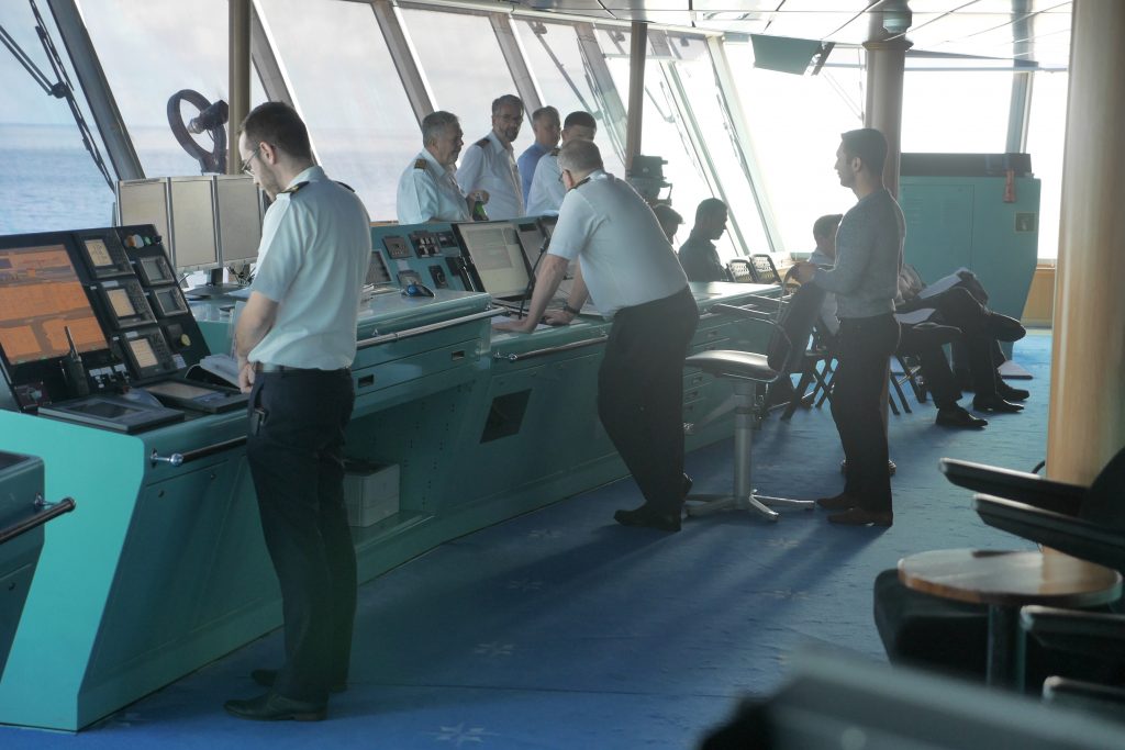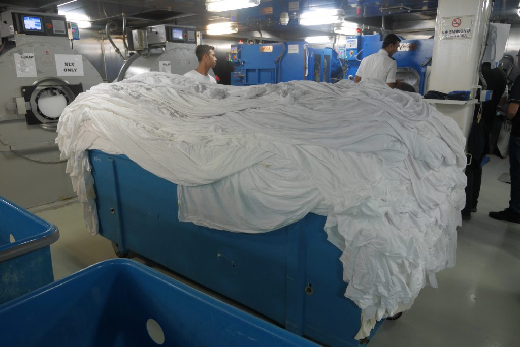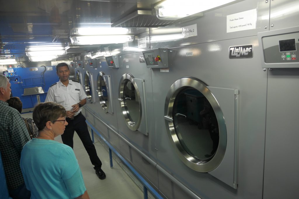 Next we’re down twelve decks to the laundry on C, two decks below water to see the enormous machines that wash 200kg at a time, the amazing ironing and folding machine, trouser press and many £others and then up to A along the I-95 (the central corridor on all ships named after an American motorway.) Here we visit the ECR or engine control room. We’re not allowed to go to the engines but the ECR is equally fascinating and the chief engineer gives a very interesting talk.