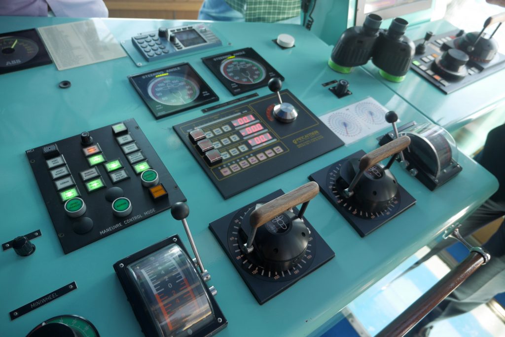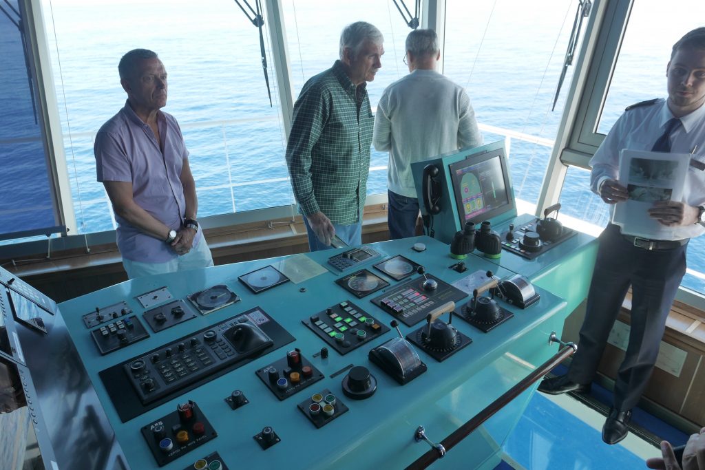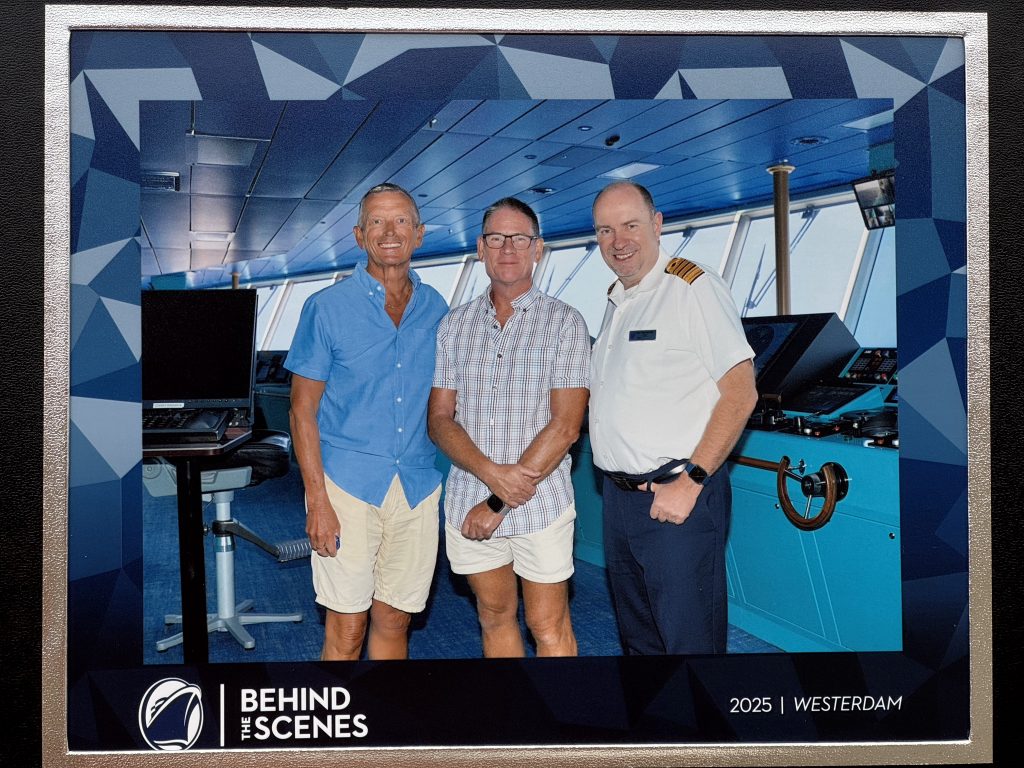 We meet Cruise Director TJ who starts the tour at the theatre‘s backstage area where we visit a dressing room and wardrobe – a busman’s holiday for us! Next we go up to the bridge, for a professional photo with Captain van der Wal, and then a very detailed talk from one of the duty officers. We love the tiny controls for steering and power, so unlike the images of yesteryear.