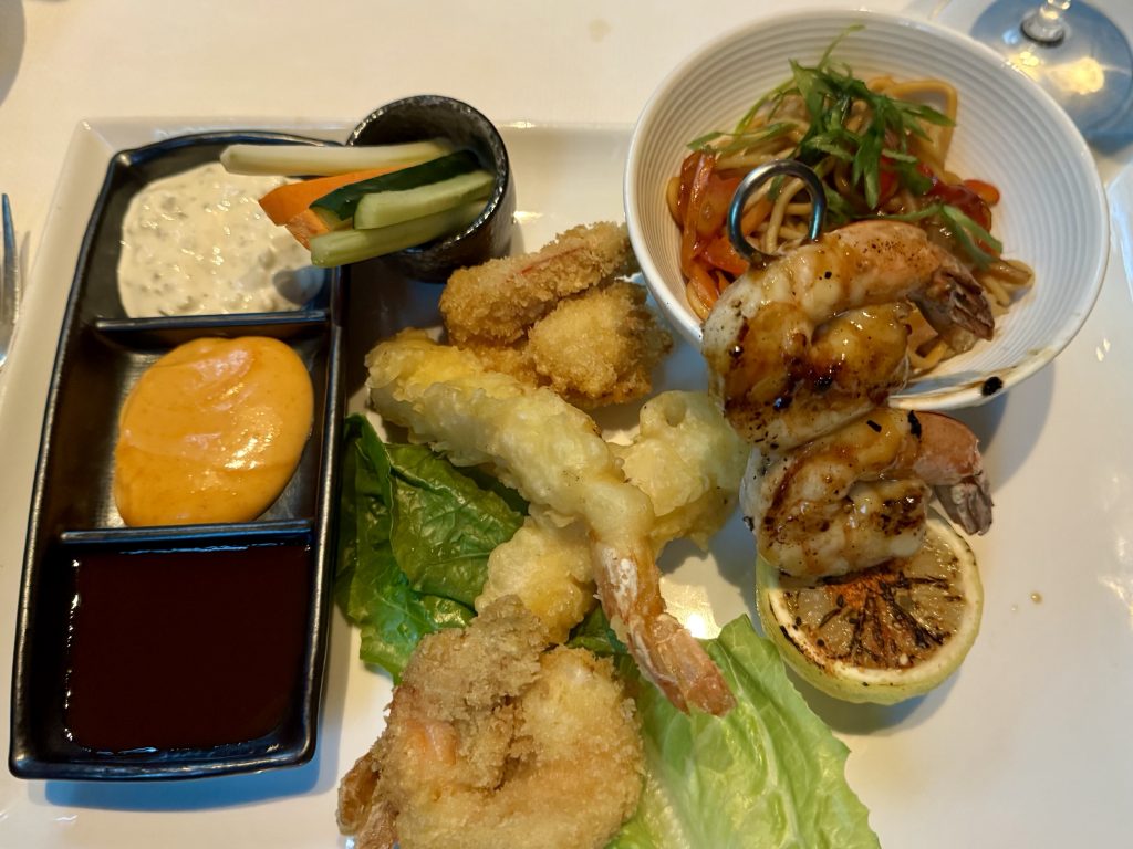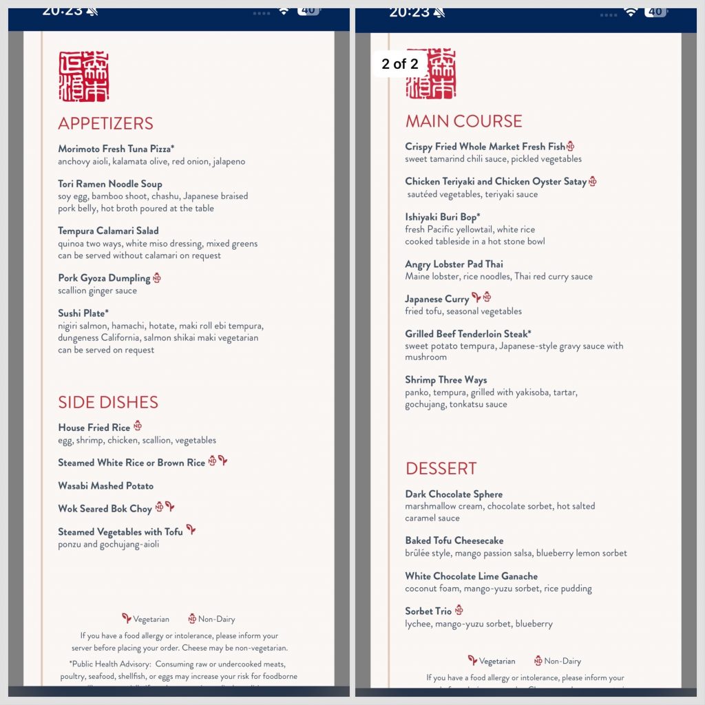 We have to cut the show short as it’s the only night in the first fortnight when the grill is turned over to restaurant Morimoto. Chef Masaharu Morimoto is one of those names like Gordon Ramsey or Thomas Keller who lends (well, sells at great expense) his name and recipes to the cruising world.