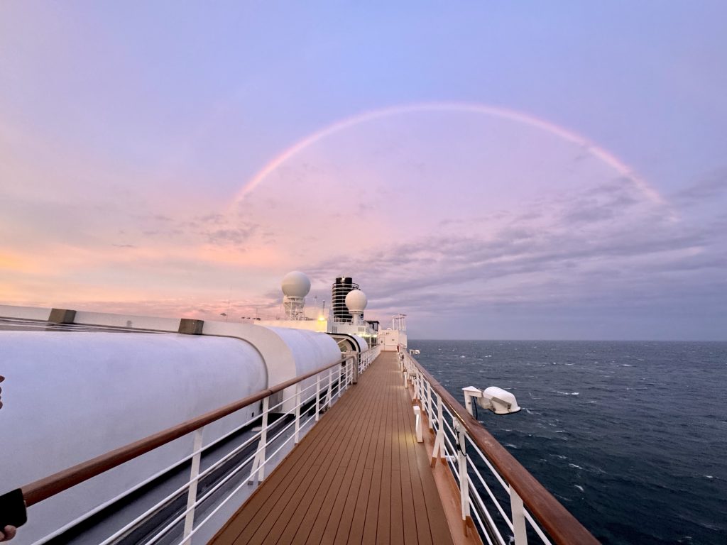 After breakfast we get our five miles in around deck 10. We find a fabulous moth. The rainbow is pretty nice, better than the photo.