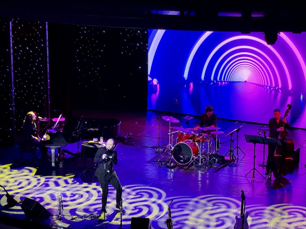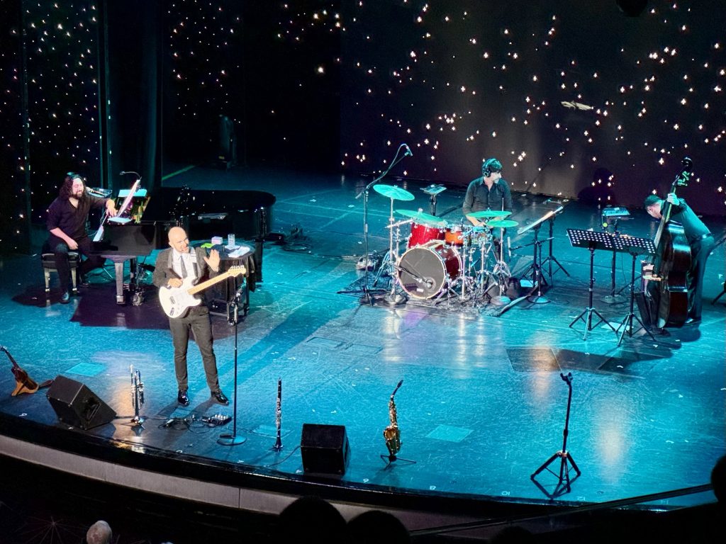 The evening starts out normally, with shower then canapés arriving with a glass of Chardonnay. Then we descend to the theatre to enjoy part of the second show of the multiinstrumentalist.